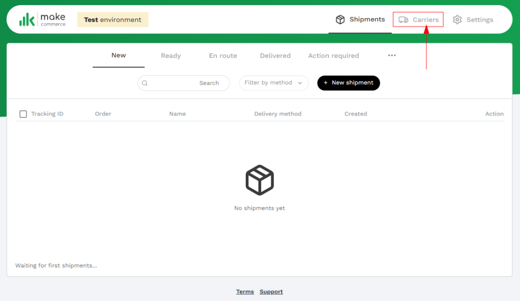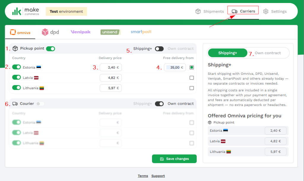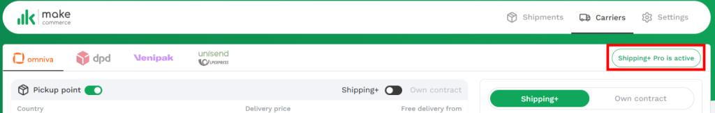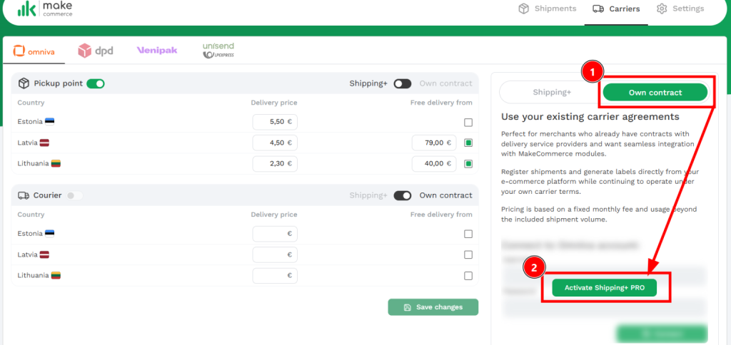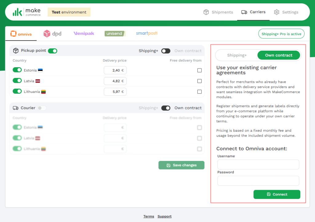 - Ava e-poe platvormil Maksekeskuse/MakeCommerce moodul – vali Carriers→ Omniva / DPD / Venipak / Unisend / SmartPosti → Own contract (oma leping) → sisesta API võtmed → Connect (Ühenda).