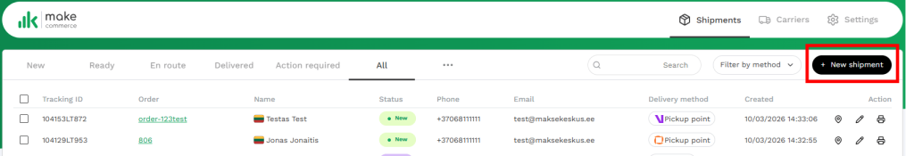 - Filtreerida saadetisi staatuse järgi: New – Uus; Ready – Valmis; En route – Teel; Delivered – Kohale toimetatud; Action required – Tegevus vajalik; All – Kõik saadetised.