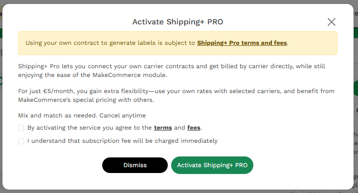 Kui soovid Tarne+ Pro paketi kasutamisest loobuda, siis ava MakeCommerce´i rakenduses vaade Carriers. Vajuta Shipping+ Pro is active (Tarne+ Pro on aktiivne) ja kinnita tellimuse tühistamine. Tellimuse eeliseid saad edasi kasutada kuni kuu jooksul alates aktiveerimisest. Soovi korral saad tellimuse igal ajal uuesti aktiveerida.