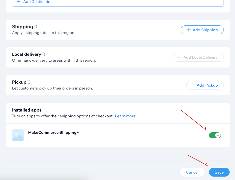 - Lehe allosas peaksid nägema valikut MakeCommerce Shipping+ sisse lülitamiseks. Lülita see sisse ja salvesta muudatused: