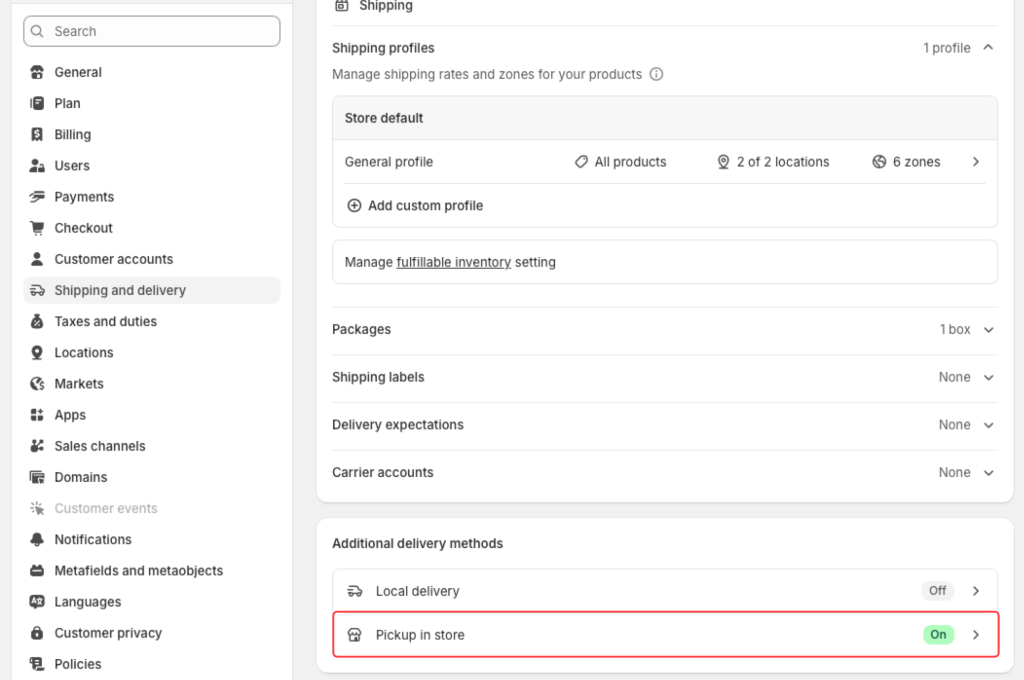 Sul tuleb ainult aktiveerida Pickup in store meetod Shopify seadete jaotises Shipping and delivery, jaotise Additional delivery methods all: