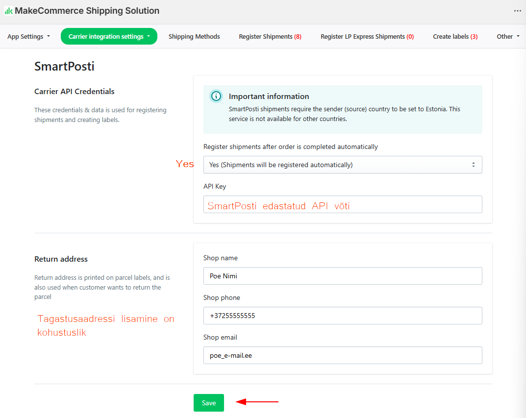 Oluline! Eemalda mittevajalikud tarnetasud. Sellisel juhul kasutab süsteem vaikimisi Standardit. - Kui kasutad pakiautomaate, peab telefoninumber e-poe kassas olema kohustuslik väli. Tarneinfo saadetakse SMS-i teel.