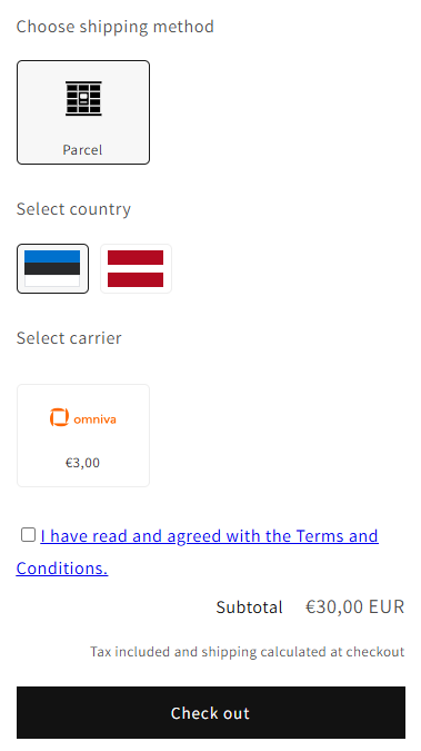 Nüüd on pakiautomaatide tarne seadistatud ning ostukorvis kuvatud järgnev valik: