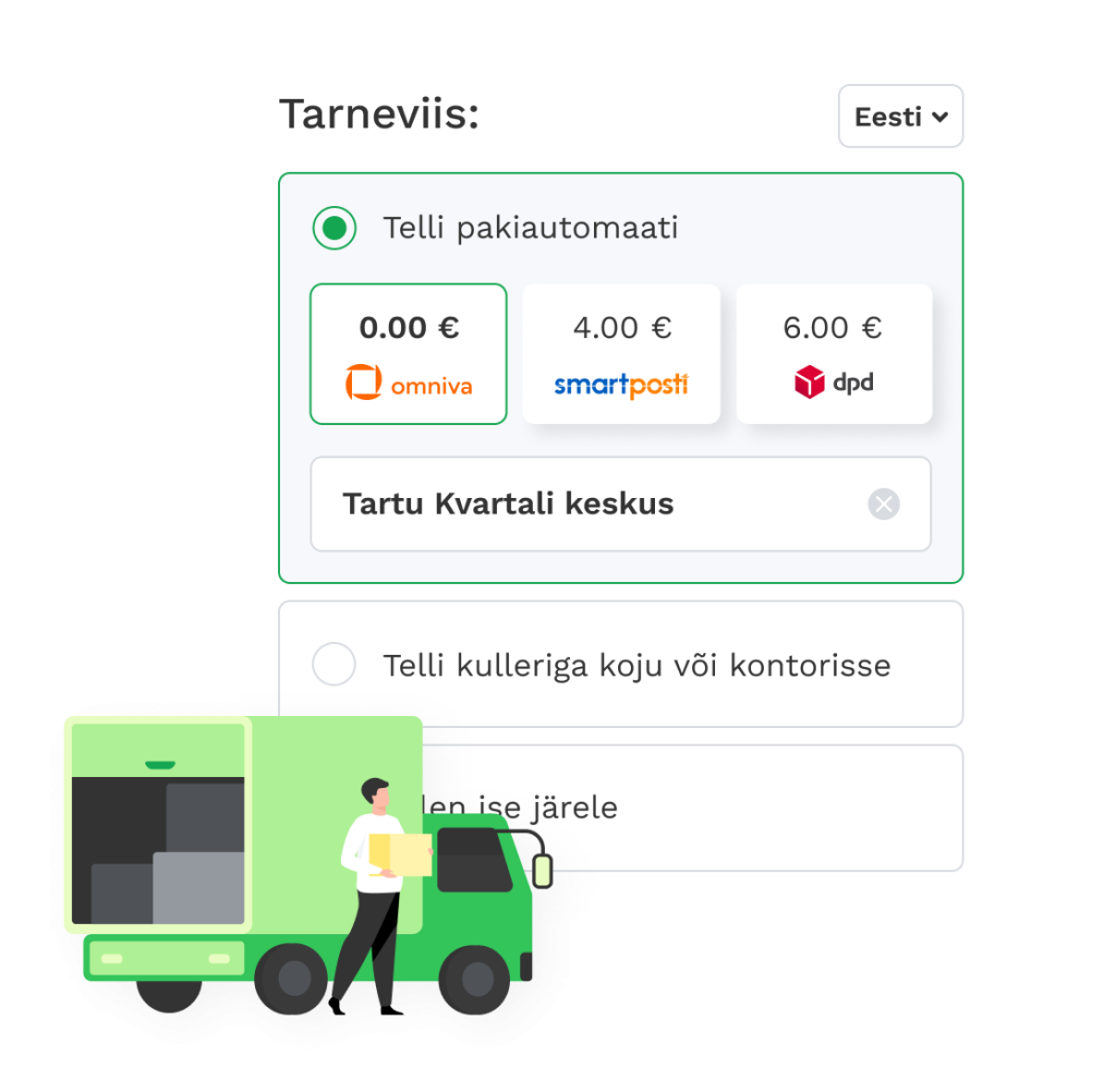 80% Eesti e-ostudest tellitakse pakiautomaati. Tarne+ teenusega saad e-poe ostud peale tasumist automaatselt registreerida, pakisildid trükkida ja mugavalt arveldada ilma tarnefirmadega eraldi lepinguid sõlmimata. Nii on makse- ja tarnelahendus ühes e-poe moodulis mugavalt koos.
