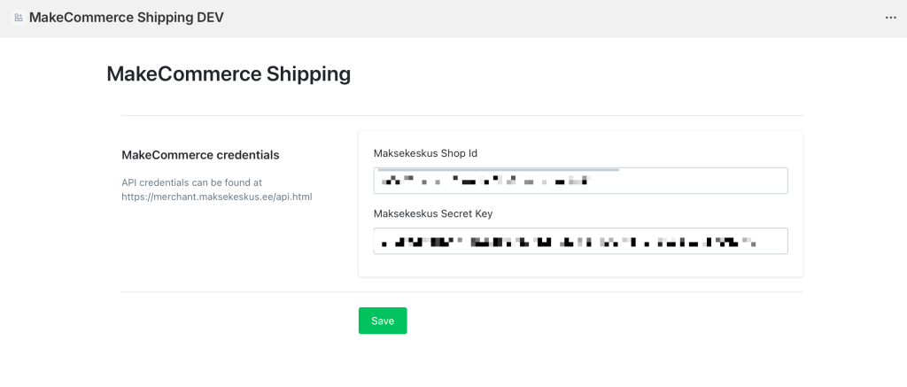 Pärast mooduli paigaldamist peaks see avanema automaatselt. Siin tuleb sisestada oma MakeCommerce API võtmed: