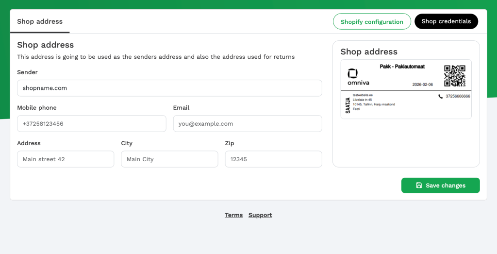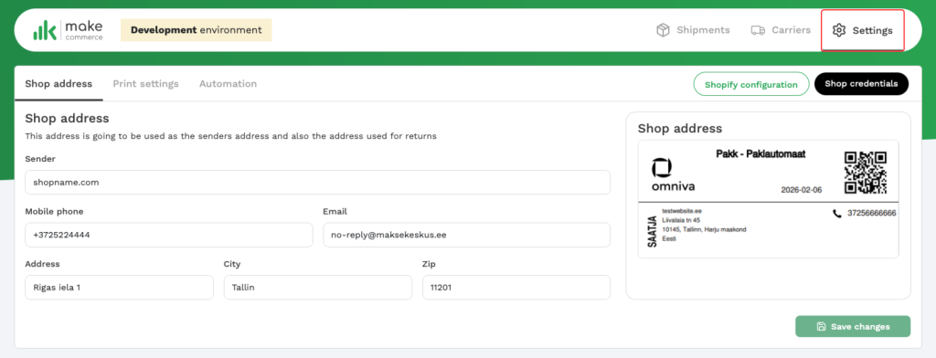 Siin saad muuta aadressi, mida kasutatakse saatja aadressina ja ka tagastusaadressina. See on ka aadress, mis trükitakse tarneetiketile.