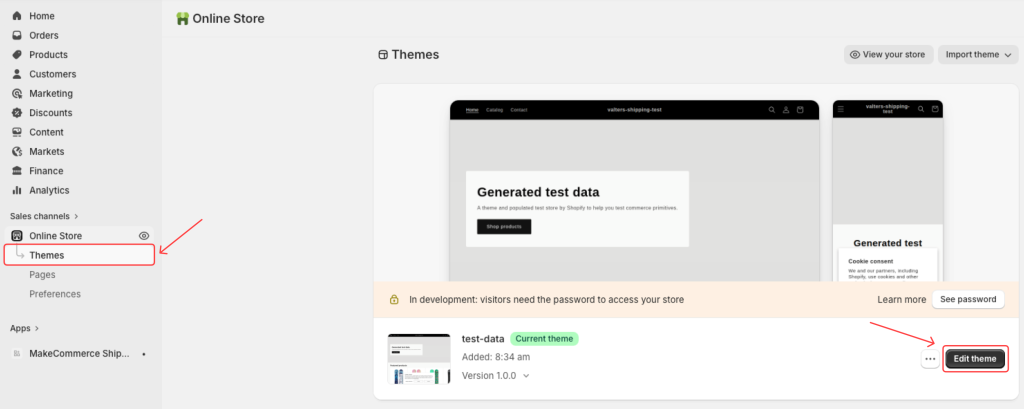Viimane samm on seadistada Shopify Theme seaded. Ava Online Store -> Themes ja vajuta Edit theme: