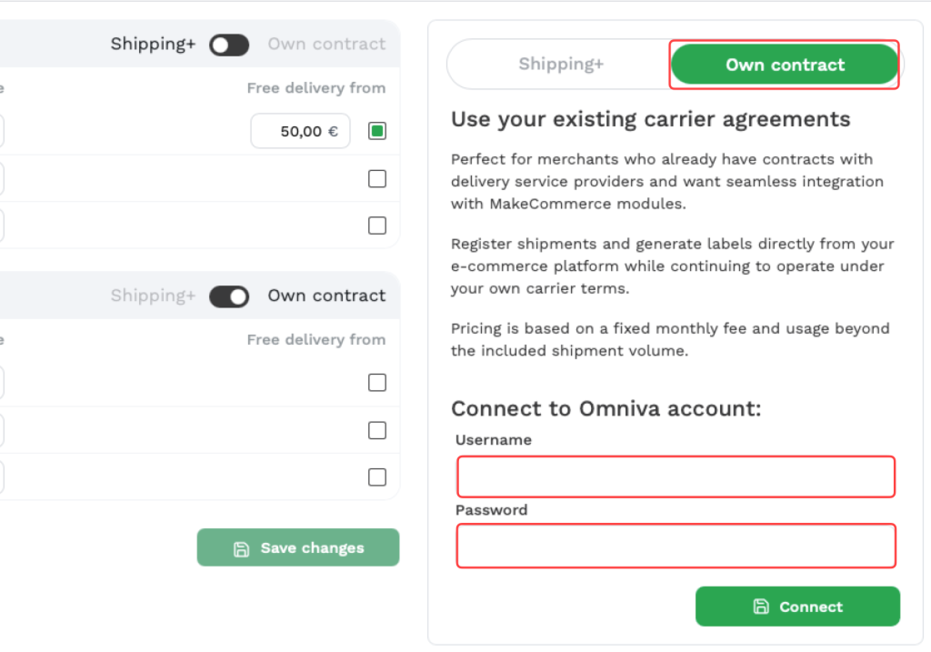 Kui Shipping+ Pro on aktiivne, pead lisama oma ligipääsuandmed jaotisesse Vedajate seaded: